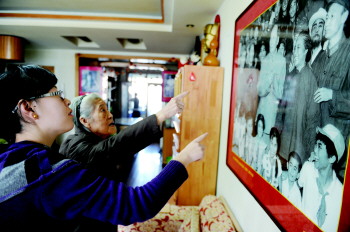 | 马桂云(张峻的老伴)正在为记者讲述摄影作品背后的故事。(边防供图) |