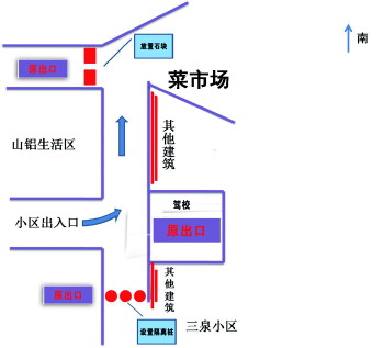 山铝生活区西门路口被堵示意图。 制图 臧振