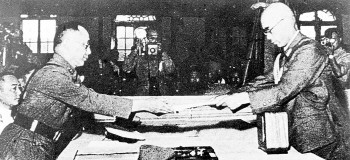 1945年9月9日,何应钦(左)在南京代表中国政府接受侵华日军总参谋长小林浅三郎递交的侵华日军总司令冈村宁次签署的投降书。(资料片)