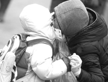 | 25日,济南一学校门口,家长和孩子戴着口罩吻别。本报记者 左庆 摄 |