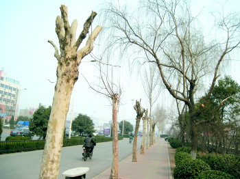 | 被“剃光头”的法桐。 本报记者 吴金彪 摄 |