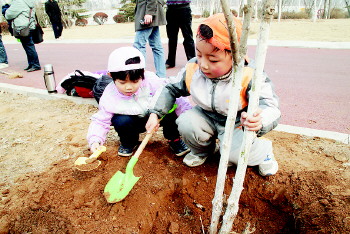 | 两个小朋友一起在园博园种下象征希望的小树苗。(资料片) |