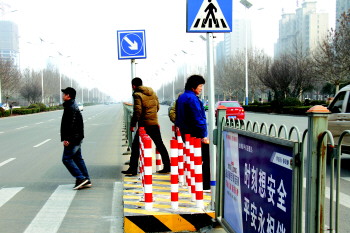 近日,德州交警支队设施大队先后在市区双向六车道的重点路段,把隔离柱替换成了高于地面的行人安全岛。25日,在东风路上,市民过马路时站在安全岛上。 本报记者 王小会 摄