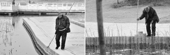 25日下午,赵王河公园河畔,一位老人拿着自制的鱼叉正沿着赵王河巡视,特制的鱼叉一头是五齿钢叉,另一头则拴着一根细长的绳子被老人握在手中,一旦看到离岸边不远处有鱼靠近,老人就一叉扎下去。