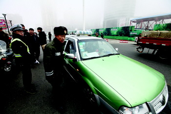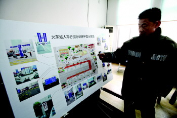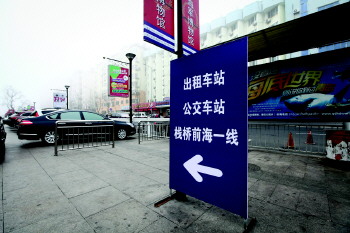 | 目前在火车站东出站口处,人车混流现象严重。 |  | 25日,执法人员在火车站东出站口进行秩序整治。 |  | 火车站联管办在火车站西广场设置的临时指示牌。 |  | 执法人员在介绍如何进行火车站人车分流。 |