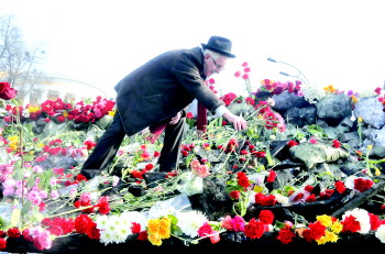 | 26日,乌克兰反政府示威者正在拆除议会大楼外的栅栏。 |  | 26日,一名男子在乌克兰首都基辅的独立广场上献花,悼念冲突遇难者。 新华/美联