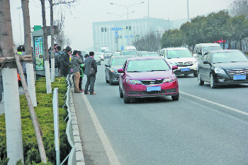 | 新出租车迟迟上不了路,手机打车又抢了普通乘客的车,打车越来越难给了黑出租生存空间,不少路过公交站牌的私家车纷纷减速,开窗揽客。 实习生 宋磊 摄 |