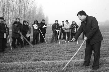 25日上午,定陶县天中街道办事处铁渠庙村麦田内,县农业局技术人员正在指导农户进行春季麦田管理。据了解,随着天气转暖,冬小麦开始进入返青期,连日来,定陶县农业局紧抓土壤墒情较好的有利时机,积极组织110余名农业技术人员,深入12个镇(办事处)田间地头,确保全县小麦丰产、农民增收。
