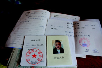 | ▲CT片显示,斌斌腰椎下方和其他孩子不同,呈鸟嘴状突出。 |  | ◥斌斌的残疾证和诊断证明。 |  | |