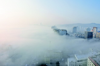 26日早7时许,海滨北路被海上吹来的平流雾笼罩,建筑物若隐若现。平流雾是暖湿空气移到较冷的陆地或水面时,因下部冷却而形成的雾。27日,随着冷空气到来,持续两三天的雾霾将被吹散。