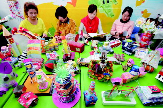 新学期伊始,市中区君山路小学幼儿园教师,把在寒假中收集到的包装盒、饮料瓶等废旧物品制作成环保教具、玩具,倡导低碳生活理念,培养孩子从小养成勤俭节约的好习惯。图为老师们制作的“环保玩具”。 本报通讯员 吉吉吉 白安玲 本报记者 袁鹏 摄影报道