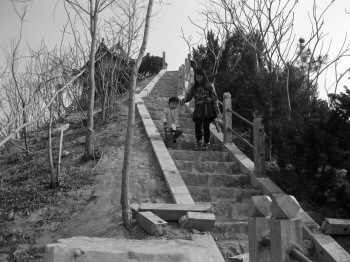 | 一名家长牵着小孩从护栏破损的台阶上下来。 本报记者 王瑞超 摄 |