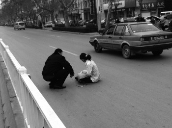 26日下午3时,一名情绪激动的女子坐在机动车道上,来往汽车纷纷避让,很是危险,任凭路人如何劝说女子也不离开。无奈之下,有好人报警,在民警的劝解下女子才起身离开。据了解,女子是因为和他人闹矛盾一时想不开。图为赶来的民警正在劝说女子。