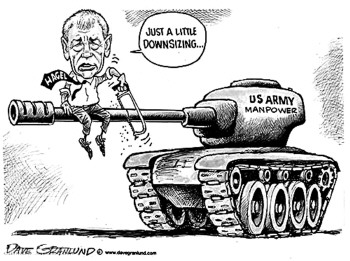 坦克炮塔上写着“美军人员数量”,坐在炮筒上的美国国防部长哈格尔一边用锯条锯炮筒,一边说:“仅仅是裁掉一点而已……”哈格尔2月24日在五角大楼公布了一项裁军计划,美军陆军现役军人规模将从52万人减少到44万到45万人之间,缩水至“二战之前的水平”。