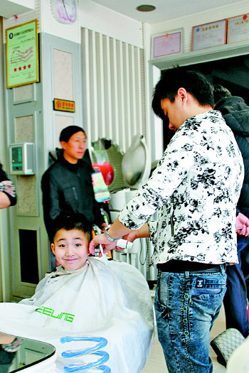 | 2日,和平路一家理发店,一名男孩在理发。本报记者 李飞 摄 |