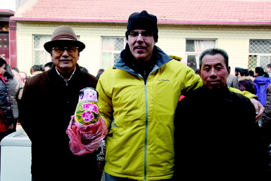 | 庙会上,人们争相购买泥娃娃。 |  | 美国友人Mark买到一个泥娃娃。 |