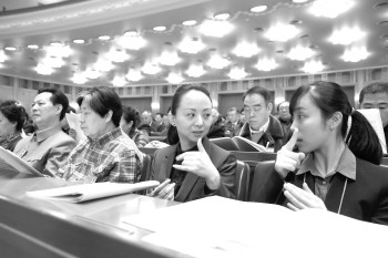 | 3日下午,全国政协委员邰丽华(中)通过手语“听”会。 新华社发 |