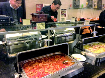 | ◥3日,政协委员驻地北京铁道大厦餐厅,记者看到自助餐以家常菜为主,有酸辣土豆丝、西红柿鸡蛋、上汤娃娃菜、红烧肉等。 |