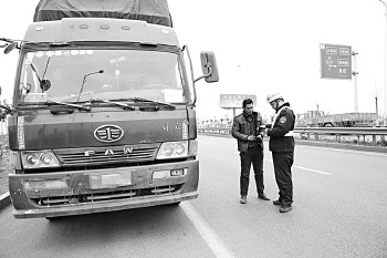 | 执法人员在南二环路上对过往的大货车进行检查。 |