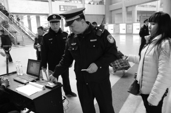 | 在潍坊火车站的入口,民警正在核查乘客的身份证信息。