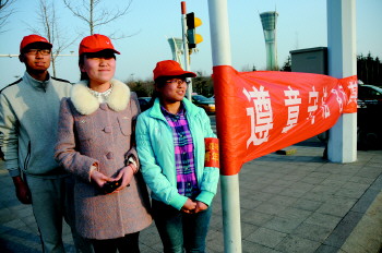 3日,在潍坊市北海路胜利街路口,交通志愿者正在路口站岗执勤、倡导市民文明出行。据了解,志愿者是来自山东交通职业学院公路与建筑学院的大学生,他们将利用课余时间跟随奎文交警二中队的民警一起上岗执勤、指挥交通,倡导市民文明出行,为大家提供良好的出行环境。