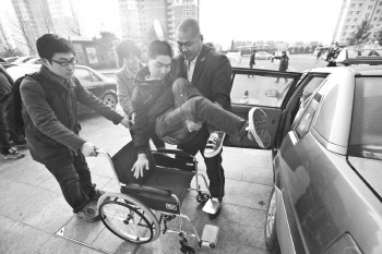 | 山东大学齐鲁医院青岛院区副院长、脑科中心主任焉传祝亲自为小朱检查身体。 本报记者 张晓鹏 摄 |  | 本报记者与青岛海博出租车公司的宋普瑞师傅一起将小朱抬下车。