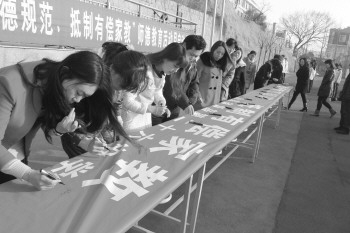 文/片 本报记者 李珍梅 日前,青岛市教育局出台新规,重拳整治有偿家教。3日,在青岛26中,市南区中小学教师签名宣誓,共同抵制有偿家教。而有偿家教能否被彻底禁止?有家长期盼彻底整治,但因市场需求大,也有家长直言有难度。 现象 培训班低调宣传 名师淡出广告语 针对青岛市教育局发布的治理中小学教师有偿家教新规,3日,在青岛26中,市南区中小学教师签名宣誓,共同抵制有偿家教。 市南区教育局要求,各学校都需设立在职教师有偿家教举报电话,并在学校醒目位置进行公示;学校与教师签订自觉抵制有偿家教承诺书,接受学生、家长和社会的监督。 新规既出,“名师”淡出培训班的广告语。 “我们以前就找过学校的老师来兼职,这也是为了打名气。不过现在风声很紧了。”台东一家校外辅导机构负责人说,现在他们也不敢轻易打出“一线在职教师”“名校教师授课”的招生广告了。 香港中路一家校外辅导机构的老板刘先生则称,学校老师校外“挣外快”已经不是什么秘密了。老师们多数是在自己家里开班,也有到机构兼职的。“你到辅导机构报班,说要找一个学校的老师辅导,他们肯定还能给你偷偷地提供。”刘先生说,他们机构曾经也聘请过一位在校老师,这位老师要求一个学生的费用是200元一节课。 岛城一所高中老师称,新规一出,老师们也“收敛”了很多,毕竟谁都不愿面临被开除的危险。 声音 正方 尖子生无奈报班 彻底整治有必要 青岛重拳整治有偿家教,部分家长表示支持。 一名高二学生家长王女士说,据她了解,孩子班里的老师很多都在家里收学生,开辅导班。“我孩子的英语老师就开了,而且还暗示班里的学生去报班。甚至声称成绩好的学生要带头报。”王女士说,儿子学习成绩还不错,但碍于老师的面子,也报了名。“去年一个暑假都在老师那学习。最后孩子跟我说确实不想去了,因为那些内容不是他想学的。”后来,王女士通过和老师沟通,孩子才没去上课。 “老师校外开班,孩子报名去上了,课堂上就能多获得老师的点名回答问题的机会。你说家长能不为孩子花这点钱?”家长王先生无奈地说,如果彻底整治了,都不让开,这倒也是好事。 反方 家长学生有需求 一禁到底有点难 “彻底禁止很难,因为有一大部分家长和学生有这个需求。”在多数家长支持整治有偿家教的同时,也有不同的声音。 家长郭女士认为,课堂上老师要面对几十个学生,一堂课的时间是有限的,只能上这些内容。每个孩子的能力也不一样,不可能每个孩子都在课堂上把所有东西都消化。“有不懂的,疑难的,怎么办?老师不可能对你进行一对一的辅导。”这个时候,郭女士认为校外的辅导有必要。而相比于报校外的辅导机构,她更倾向选择在校的老师。“毕竟老师了解孩子,对高考的变化和题型掌握较多。”郭女士说,在儿子高三冲刺阶段,她托朋友的关系,“慕名”找到一位数学老师,260元一节课,两小时。 为此,家长心存疑惑,校外辅导是双方“你情我愿”的事儿,彻底根治比较困难,会不会只是更隐蔽,规模更小了? 3日早晨,26中学校老师签名宣誓抵制有偿家教。