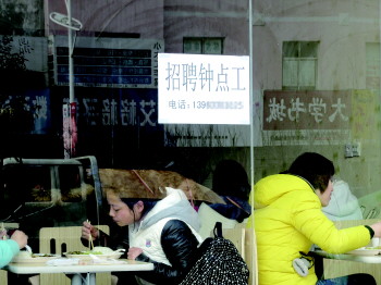 | 大学生开学了,大学城内又热闹起来,一家快餐店贴出了招聘钟点工的启事。 |