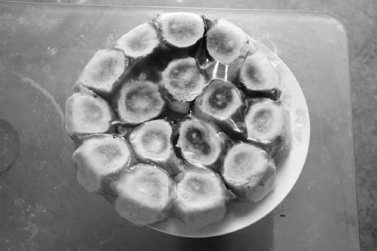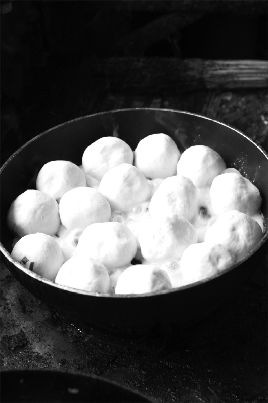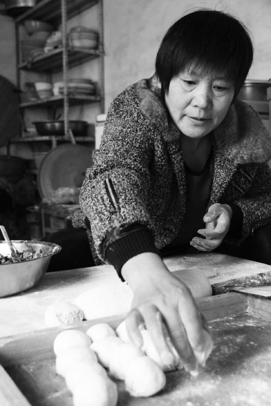 | 刚刚下锅的包子。 |  | 临出锅之前还要再浇上一遍食用油。 |  | |  | 做好的水煎包。 |  | 水煎包的包法也是与众不同的。一手拿着面皮,一手填上馅儿,然后两手一捏就好了,没有一个褶子。 |