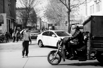 | 一名学生在过马路时,晃动着红领巾提醒过往车辆减速。 本报记者 姜文洁 摄 |