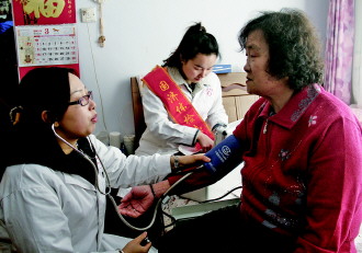 3月5日,在鲸园街道办光明社区内,共青团威海市委组织300余名青年志愿者,分别开展入户维修家电、健康查体等服务。图为国济体检中心的医疗志愿者还走进社区为独居老人体检送温暖。