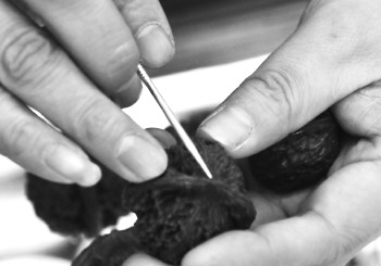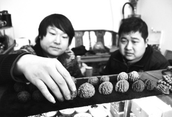 | 挑选核桃配对。 |  | 核桃盘得越久,颜色越光亮。 |  | 两对鸳鸯形状的异形核桃。 |  | 测量核桃。 |  | 剔除污渍。 |  | 刷核桃。 |