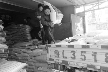 | 5日,日照市供销社内,工作人员忙着将化肥装车。