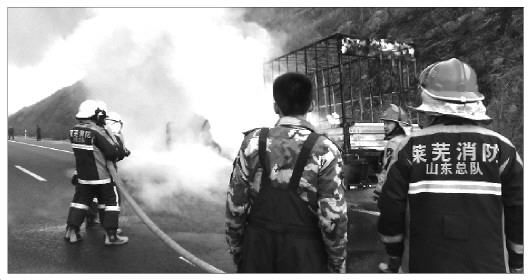 本报3月6日讯(记者 王浩奇 通讯员 刘彬) 5日17点15分,莱芜市公安消防支队指挥中心接到群众报警称,在济青高速往青岛方向过铁车隧道附近一辆货车失火,情况危急,急需救援。接到报警后支队指挥中心迅速指令辖区鹏泉中队立即出动3辆消防水罐车,18名消防官兵“火速”赶赴现场救援。 现场一辆泰安牌照的货车停靠在高速路旁正猛烈燃烧,车上装运着鸭苗活禽,浓烟滚滚,不时发出爆裂声。了解情况后,消防官兵迅速设置警戒线,提醒高速路上过往车辆注意避让,防止发生交通意外,同时快速出单干线一支水枪对着火的车体进行打水扑救。经过15分钟的奋力扑救,货车车体明火被成功扑灭,庆幸的是货车司机及时逃离了车体,没有造成人员伤亡事故。 经过询问司机得知,车辆在高速路上行驶中突然发现发动机附近冒烟起火,停车后驾驶室已被引燃,一车鸭苗被全部烧毁,起火原因在进一步调查中。 莱芜消防提醒广大货车车主,货车行驶前要做好车辆保养检修,保证车辆安全行驶的前提下,应配备完整好用的车载灭火器,确保发现车辆火情时能及时扑救,减少车辆财产损失。