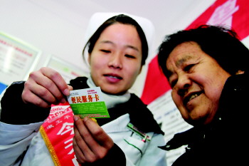 工作人员为社区居民讲解便民服务卡的使用方法。 本报记者 王鸿哲 摄