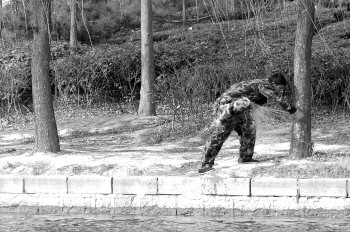 10日下午,赵王河畔,两市民在赵王河上忙着布置渔网。只见一名男子从河西侧开始扯线,绕过小桥一直撤到河对岸,粗略估计整个渔网有三四十米长。“这样明目张胆地撒网捕鱼,真是不应该了,还希望有关部门能及时管管。”一位散步的市民说。