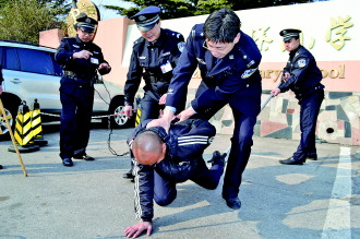 | ▲日前,古寨中学、古寨小学联合古寨派出所民警进行了防恐演练,图为“恐怖分子”被现场制服。 见习记者 桑志朋 摄 |