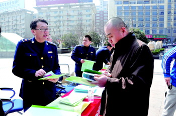 “3·15”消费者权益日到来之际,13日,高新区市场监管局工商、食药、质监等部门在雨滴广场开展食品安全咨询及新《消费者权益保护法》宣传活动,引来诸多市民咨询,雨滴广场近30家餐饮店宣誓诚信经营。 本报见习记者 任丽媛 摄