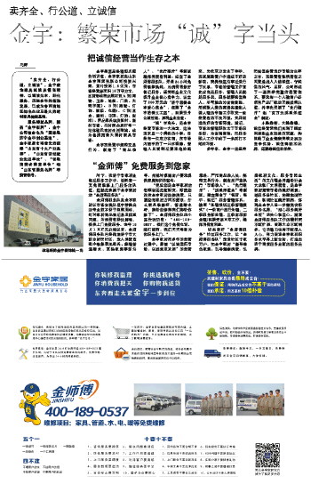 改造后的金宇装饰城一角 卖齐全、行公道、立诚信 马辉 时下,在济宁市家居业售后服务工作中,活跃着一支免费维修上门服务的队伍,这就是隶属于金宇家居的“金师傅服务队”。 金师傅服务队由金宇家居从市场安装队伍中精挑出的专业技术骨干组建而成,针对家居商品售后易发质量问题,为消费者排忧解难,提供上门免费服务。去年10月1日正式启动以来,金师傅服务队已经跑遍济宁市大部分居民社区,走入消费者家中维修清洗家具、修理管道漏水、更换家装零部件等,并随时根据客户要求提供家装知识的咨询。 “无论您是金宇家居的老顾客还是新朋友,即使您没在金宇家居购物消费,只要您有家居方面的需求,什么家具维修呀,管道漏水呀,能给您修得我们都给你修了”。金师傅服务队的小陈告诉记者:“400-189-0537,拨打这个免费电话,随打随到,我们天天等着为你服务上门。” 金宇家居在多年的经营过程中,遵循“以诚信拓市场,以质量求发展”的经营策略,严把商品准入关,规范交易行为,制定并严格执行“市场准入”、“先行赔付”、“质量保证金”等制度,建立健全了“售前、售中、售后”服务管理体系,按照“处理投诉三级管理模式”(一级商户自行处理,二级服务部处理,三级客服部处理)积极开展日常工作,确保消费者利益。 切实做好“金师傅服务”社区服务工作,让“金师傅服务队”走进社区千家万户,把金宇家居“倡导绿色家装,引导健康消费,弘扬家居文化,服务市民生活”的文化理念传递给社会大众和广大消费者,是金宇家居繁荣市场的美好愿景;送服务进社区,构建和谐社会、和谐社区美好家园,体现出金宇人进一步擦亮省级服务名牌,“用心服务美好生活”的决心和信心。随着金师傅服务队工作的辐射面不断扩展,受惠大众不断增多,它的魅力也将不断深入人心,有力促进金宇家居服务水平再上新台阶,打造出济宁商贸服务业新的服务品牌。 “金师傅”免费服务到您家 金宇集团总经理邹庆超告诉记者,金宇家居由山东金宇商贸有限公司投资兴建,累计投诉1.5亿元,市场经营总面积18万平方米,目前形成精品建材馆A馆(陶瓷、卫浴、地板、门类、古玩字画)、B馆(陶瓷、灯饰、橱柜、电器)、C馆(五金、壁纸、吊顶、灯饰、窗帘)、精品家具城及板材、型材市场、石材精品展厅等一站体验式家居生活商城,成为鲁西南最大建材家具市场。 金宇在经营中规范交易行为,制定了“商品准入”、“先行赔付”等制度确保消费者利益。成立了金师傅服务队,开通24小时免费维修热线,为消费者做好售后服务。坚持用企业文化提升企业核心竞争力,设立了200万元的“济宁慈善金宇爱心基金”,组建了“金宇慈善义工团”,积极投身公益活动,展现企业价值。 “诚”字当头,是金宇经营市场的一大法宝,这法宝来自一个偶然的小事。曾经有一位南方客商,在市场内随手扔了一只冰棍棒,管理人员看到后要求他捡起来,为此双方发生了争吵,在周围经营户中造成不好的影响。我得知这件事后进行了反思,市场的管理工作首先应当是服务,管理人员就是服务员,服务就要诚信待人,尽可能的为客商着想,用细致入微的真情实意和入情入理的辛勤工作改变一些经营者的不良习惯,共同创造良好的市场环境。随后,市场的管理部改为了市场服务部,为客商着想,把服务融入工作中成了一条雷打不动的习惯。 多年来,金宇一直坚持把诚信经营当作市场的生存之本,在经营者和消费者之间营造出人人讲诚信、守诚信的风气。目前,公司形成了一套科学完整的运营体系,要求每一个入驻商户必须有产品厂家的正规质量认证,并率先开展了“先行赔付”和“百万元质量保证金”制度。 小胜靠智,大胜靠德。诚信经营使我们实现了顾客利益和企业效益的双赢,构筑起了企业健康持续发展的竞争优势。诚信铸就的品牌,还要靠诚信来保持。 把诚信经营当作生存之本 “卖齐全、行公道、立诚信”,金宇装饰家具城秉承儒商精神,以诚信为本,细化服务,历经多年的蓬勃发展,已成为鲁西南地区知名企业及最大的建材家具物流基地。 服务铸就品牌,擦亮“金字招牌”。金宇公司被命名为“国家级济宁金宇创业基地”,金宇家居市场曾先后获得“山东省十大产业集群”、“山东省劳动就业先进单位”、“省级消费者满意单位”和“山东省服务名牌”等荣誉称号。 金宇:繁荣市场“诚”字当头