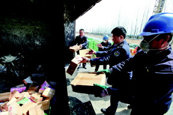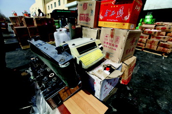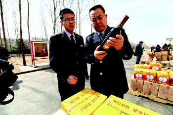 | 图为工作人员将待销毁的假冒伪劣产品扔进废物暂存库。 本报记者 杨广帅 摄 |  | 销毁现场堆放的假冒伪劣产品。 本报记者 杨广帅 摄 |  | 执法人员在现场查看一瓶劣质洋酒。 本报记者 杨广帅 摄 |  | 执法人员收缴的造假工具。 本报记者 杨广帅 摄 |