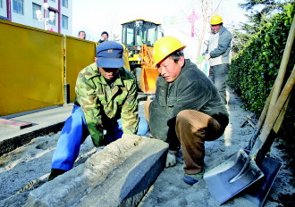 | ▲13日,在育华路附近,施工工人将旧的路缘石移除。