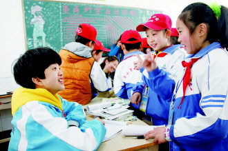 12日,薛城区南临城小学组织学生来到枣庄市特殊教育学校,与特教学校的学生开展联谊活动,并向他们捐赠一批文体用品,奉献爱心。图为南小学生在向聋哑学生学习手势语。 本报通讯员 胡乐彪 本报记者 白雪岩 摄影报道