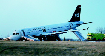 | 13日,在美国费城国际机场,一架全美航空公司客机机头触地横陈在跑道上。 新华/美联