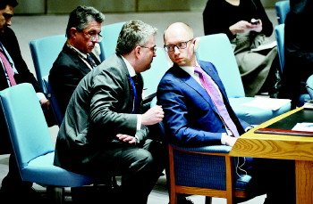 | ◤13日,乌克兰临时政府总理亚采纽克(右)在纽约联合国总部参加安理会就乌克兰局势举行的紧急会议。