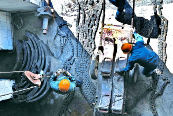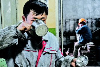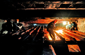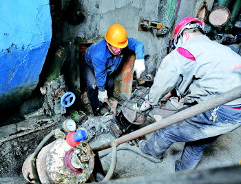 | 在漆黑闷热的锅炉内,温度达到了40℃—50℃,工人们在维修被高温烧蚀的炉膛部件。 |  | 漆黑的锅炉空间狭小,机修工活动起来很费劲。 |  | ▲将部件运出炉膛需要用人抬拉。 |  | 日常机件维护。 |  | ◤休息时就爬到锅炉外面喘口气、喝口水。 |