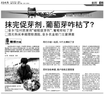 本报济宁3月16日讯(记者 高雯 通讯员 杜修镇) 3月5日本报曾报道“抹完促芽剂,葡萄芽咋枯了”一事,种植户遭遇理赔难题。14日,在金乡县工商部门的调解下,经营者石某对种植户进行了赔偿。而因石某销售的是假冒产品,农业部门对其做出了处罚。 3月份本该是葡萄发芽、长穗的时候,而金乡葡萄种植户李为倩和同村人一起种植的8个大棚里的葡萄,发出的新芽却因使用了葡萄促芽剂而枯萎了。找促芽剂的经销商石某理论,却因购买时没有保留单据,被石某拒绝赔偿。3月5日,本报报道此事之后,金乡县农业局调查发现,李为倩等人使用的促芽剂产品的肥料登记证号与产品标签不符,属违规生产不能交易,目前农业部门已经立案。 随后,李为倩等人将石某投诉到金乡工商部门。金乡县工商局在农业部门的配合下,确定该产品为假冒的不合格产品。在执法人员调解之下,经销商答应赔偿每个大棚2500元,总计2万元。 “枯萎的芽长不出来了,今年的收成肯定受影响,但领到了赔偿款,也能弥补一定的损失,心里也舒服多了。”李为倩说,减产的葡萄给每个大棚带来至少一万元的损失,赔偿款只能解决一部分问题,为了尽量弥补损失,他在大棚中种植了甘蓝菜,其他农户也种了些蔬菜类农作物。“一开始经销商不承认,后来又打算用几袋化肥打发我们,现在能有这些赔偿我们已经很满足了,非常感谢《齐鲁晚报》的帮助。”李为倩说。
