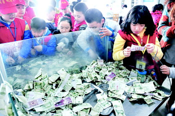 | 小记者们体验文明乘车。本报记者 张晓科 摄 |  | 小记者们查看假币、残币。本报记者 张晓科 摄 |