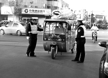 | 14日下午,在德州市客运中心附近,交警对违规运营三轮车进行集中整治。 本报记者 王小会 摄 |