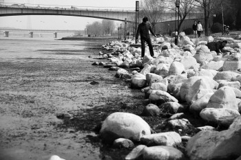 16日,在锦绣川风景区内岔河水位下降,岸边的景观石裸露出来,有不少家长带着孩子在岔河边的石头上玩耍。 本报记者 王小会 摄