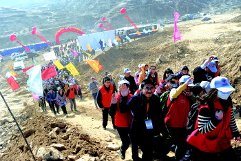| 植树的励志青年们浩浩荡荡地向山上进发。